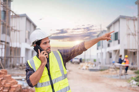 Engineer man worker in safety white helmet and vest checking project maintenance daily on site outdoor. civil engineer or architect with hardhat on construction site.