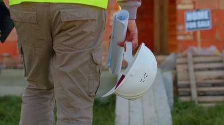 Real estate foreman designer building project architect. Professional civil engineer developer builder with helmet in hand walking to construction site. Constructor foreman. Start of working day