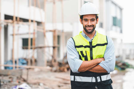 The picture of the construction worker or project manager is working on the construction site while wearing hard hat and safety jacket also require skill like safety knowledge, technical skill. AIG43.