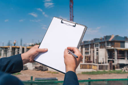 The chief in a jacket and a construction helmet with documents in his hands, against the background of a tower crane and the sky with clouds. House construction inspection