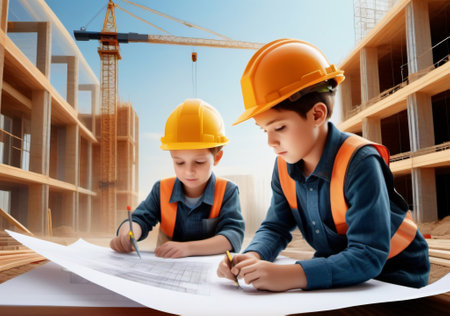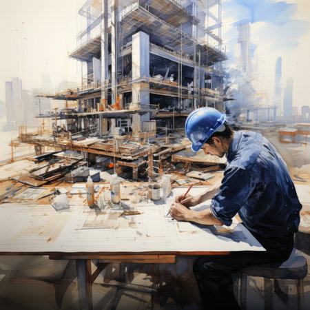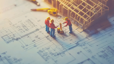 Dynamic blueprint scene with miniature builders engaged in architectural design and construction