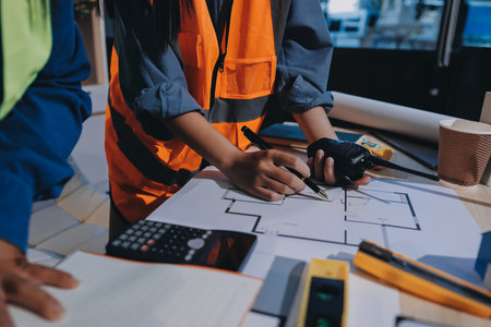 engineer meeting for architectural project, working with partner and engineering tools at workplace. Architect working on blueprint. Construction concept.