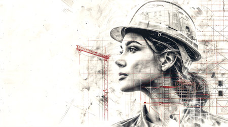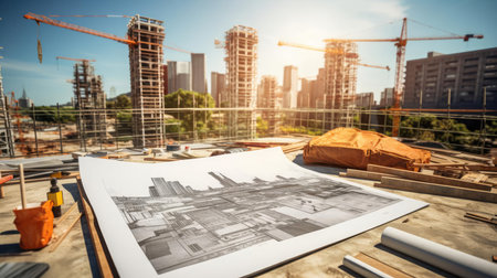 A close-up captures a yellow hard hat resting on a blueprint, accompanied by a digital tablet and pencils. Construction cranes and skyscrapers form the backdrop, creating an urban environment under daylight conditions. This scene suits commercial applications emphasizing infrastructure, planning, and technology.