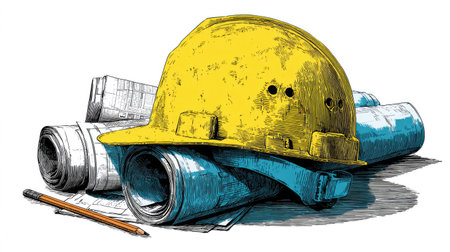 A yellow hard hat rests atop rolled-up blueprints with a pencil alongside, presented against a white background. The image features a vibrant color palette with shades of yellow and blue. The composition, utilizing overhead lighting, would be appropriate for various illustrative and commercial applications relating to construction and planning.