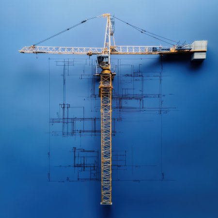 Cartoon blueprint of a construction project with miniature builders at a minimalist site