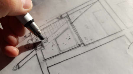 An architect, a home design engineer, is drafting a house plan for a client in his office. He is writing a house plan based on the needs of his clients. House building and interior ideas.