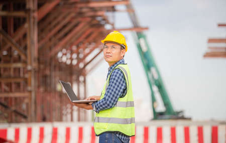 Engineer checking project at the building site, Man in hardhat with laptop at the infrastructure construction site