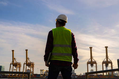 Portrait of engineering man wearing uniform safety suit and helmet in industrial containers.