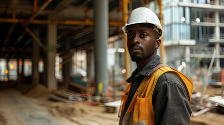 Portrait of a black construction worker dressed in work uniform and wearing a hard hat. He is posing at his work site, a building under construction