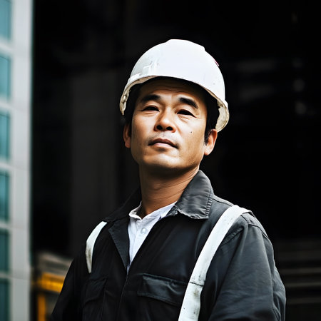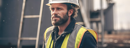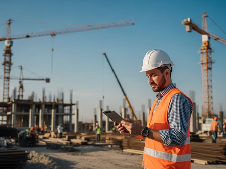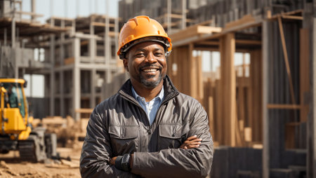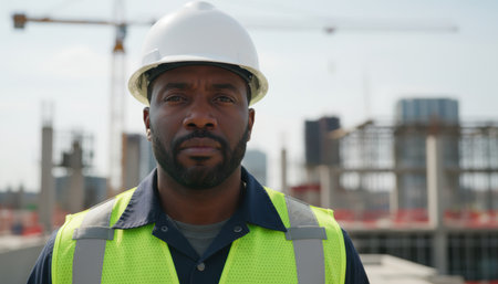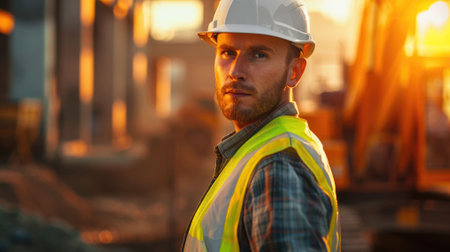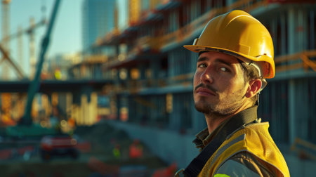 A man wearing a hard hat stands in front of a construction site, looking focused on the work ahead. Various construction materials and equipment can be seen in the background.