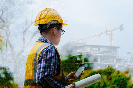 Smart Asian worker man or male civil engineer with protective safety helmet and reflective vest using digital tablet for project planning and checking architectural drawing at construction site.