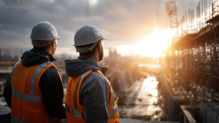 Two men in orange vests are standing on a construction site, looking out over the city. The sun is setting in the background, casting a warm glow over the scene. Scene is one of anticipation