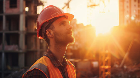 Construction worker in high-visibility vest and hard hat overlooking an active construction site with cranes and building structures during sunset.