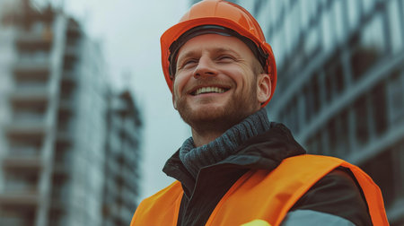 Confident engineer inspects construction site while overseeing project dynamics with a smile