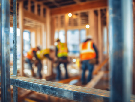 Workers in safety gear assemble wooden components within an unfinished building reinforced by a prominent metal frame, highlighting active craftsmanship and cons