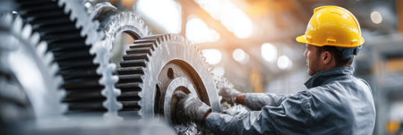 A worker in a hard hat examines large gears in an industrial setting, ensuring proper functionality and maintenance during daylight hours.