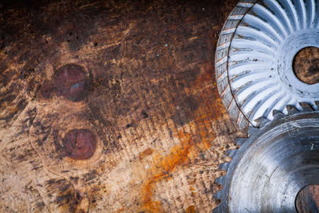 Pile of old metal gears and cogs. Spare parts for industrial machines.