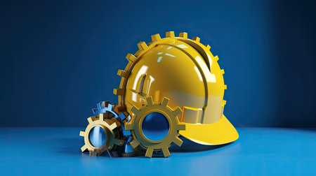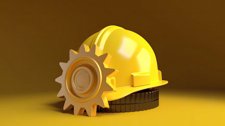This image features an inventive arrangement of pink hard hats and gears, effectively symbolizing safety and creativity in the construction industry.