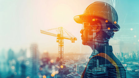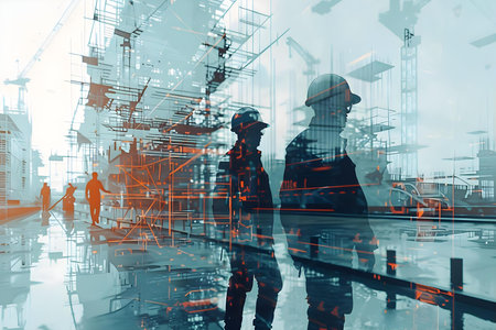Double exposure illustration depicting building engineers and construction workers engaged with advanced civil equipment technology, designed for digital art, with copy space