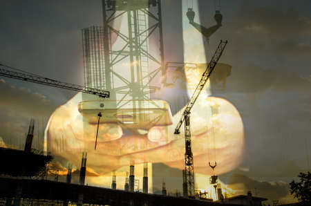 Double exposure of Engineer or Technician man working on construction site with cityscape and building background, Construction concept