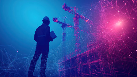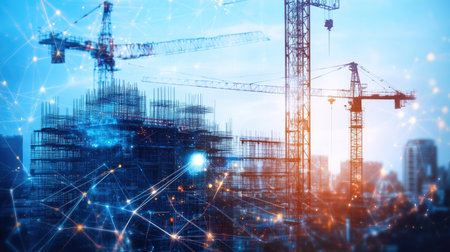 Digital tech and construction cranes in double exposure, symbolizing tech-driven engineering innovation. No city backdrop.