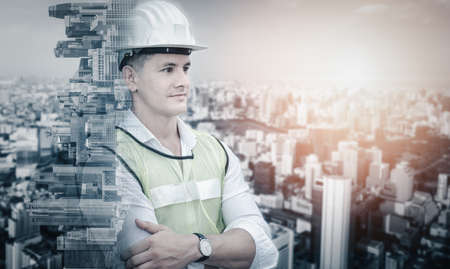 Double exposure of engineer with safety helmet and building background. Mixed media