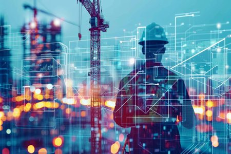 Digital transformation in construction: Double exposure of technology icons and cranes, showing modern engineering practices.
