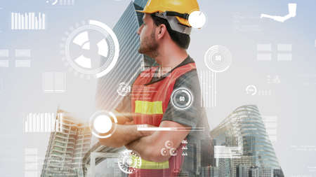 Future building construction and inventive engineering project concept with HUD hologram graphic design. Building engineer, architect people or construction worker works with modern civil technology.