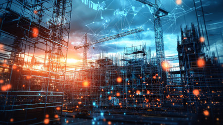 High-tech construction site featuring cranes and scaffolding with digital networks symbolizes modern urban development and energy efficiency efforts at sunset.