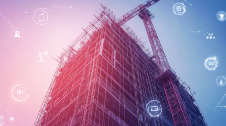 Double exposure of digital icons and construction cranes, showcasing the integration of technology in engineering.