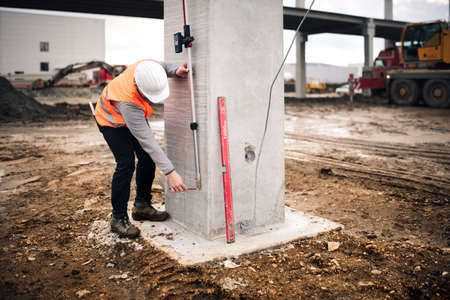 workman checks the construction parameters of foundation