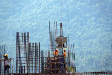 Construction team working at height site. Construction workers fabricating steel reinforcement bar at the construction site. Builder worker in safety protective equipment.
