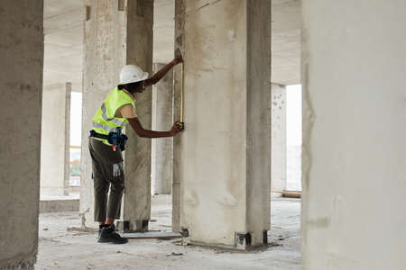 Cheerful industrial climber measuring with level tube during construction works