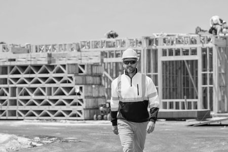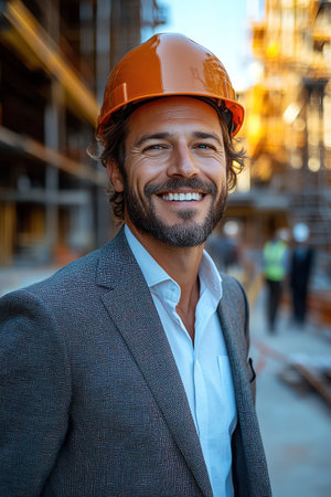 Confident engineer inspects construction site while overseeing project dynamics with a smile