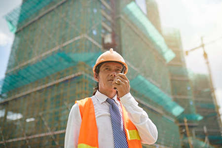 Architect engineer on a phone call conversation at a construction site building working in a safety helmet. Architecture and industrial designer in a serious discussion about engineering project