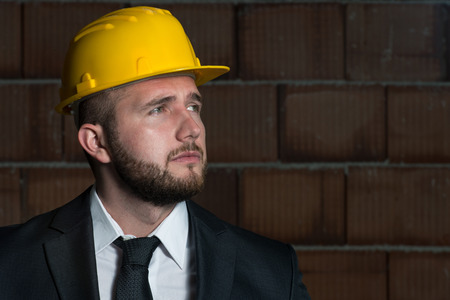 Construction manager. Builder man. Worker with hardhat. Industry construction. Builder civil engineer at site building. Supervisor engineer. Worker at construction site. Copy space advertisement