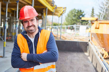 Man as a construction worker with a red hard hat crossed on the shell of the construction site with his arms