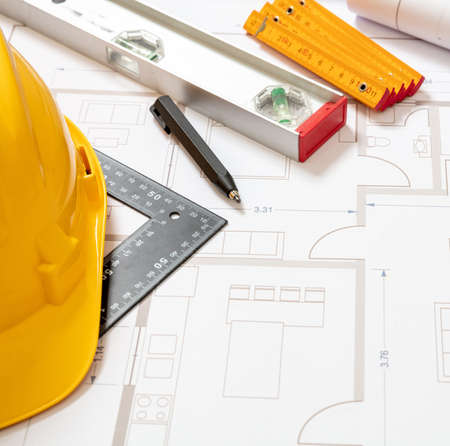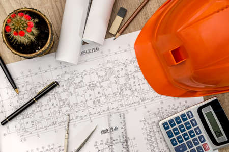 Project blueprints and labor worker hardhat yellow color, Housing project construction, construction site office background.