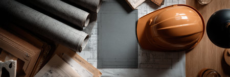 real estate concept with hard hat blueprints tools and copyspace