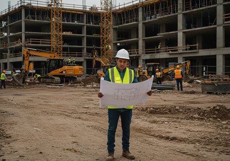 Architect working on a construction site, he is standing with blueprint