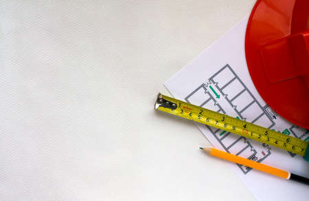 Hard hat, yellow pencil, measuring tape and building plans with free place