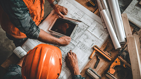 Two construction workers are reviewing architectural blueprints on a wooden table, possibly in a workshop or similar workspace. Various construction tools and materials are scattered around the table. A tablet computer is in use, suggesting the use of technology in modern construction planning.