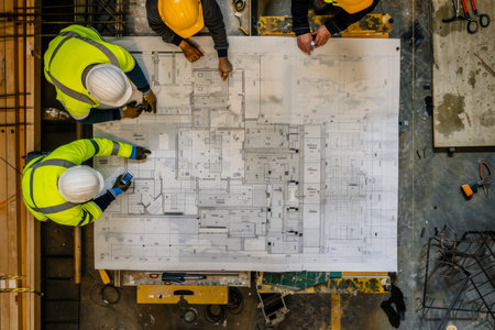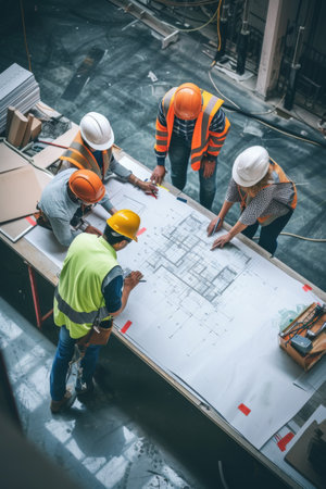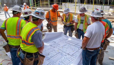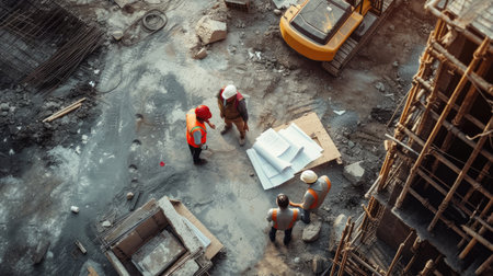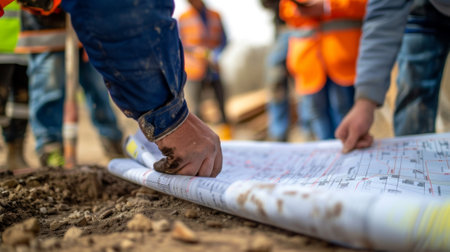 Construction workers in safety gear studying blueprints at active site, teamwork in progress