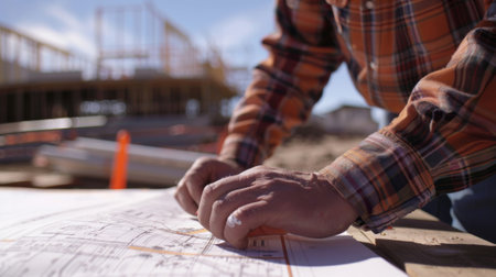 Construction workers collaborating on a detailed blueprint, discussing plans and measurements for a new building project during daylight hours