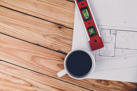 Cup of coffee with measurement tool and blueprint, architectural concept