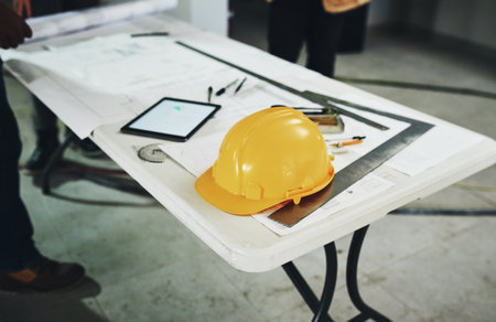 Safety is always part of the plan. various tools and a blueprint on a table at a construction site.