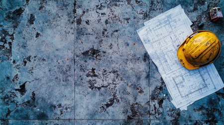 A gray background with concrete floor tiles, a yellow construction helmet, and blueprints on the side, in a flat lay composition, close-up, high-resolution photography, with insanely detailed, fine details, isolated plain, a stock photo, professional color grading, and white lighting. --chaos 30 --ar 16:9 --v 6.1 Job ID: 15f13c16-474b-4b03-8139-c77058fb7ed0