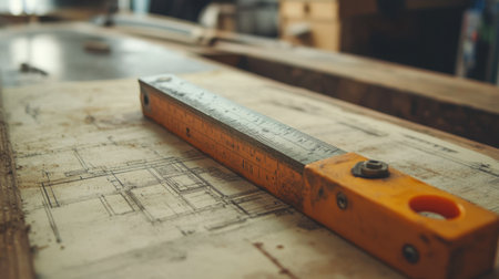 This image captures a vintage carpenter's square on a faded blueprint, revealing intricate design details, reflecting the artistry and precision involved in woodworking projects.
