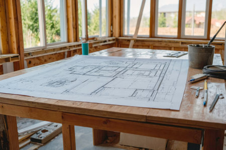 Building plan and contractor belongings around it