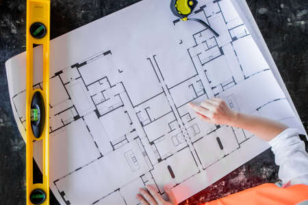 house blueprint of real estate project at architect engineer workplace. architectural plan. building construction tool top view